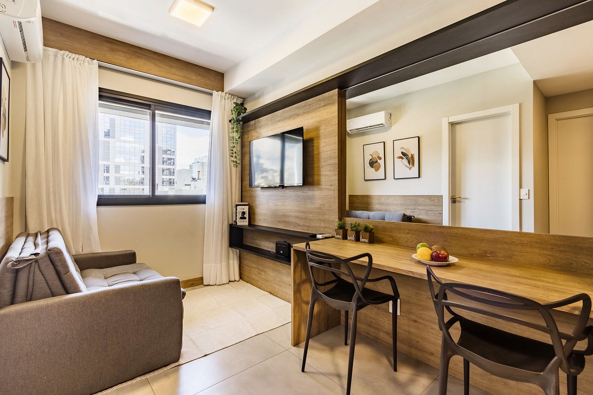 Furnished apartment ready for moving in, staying, or working from home in GO Carlos Gomes, an incredible and complete building in the Boa Vista neighborhood of Porto Alegre. Flexible for short or long stays, with convenience, technology, and services at your disposal.