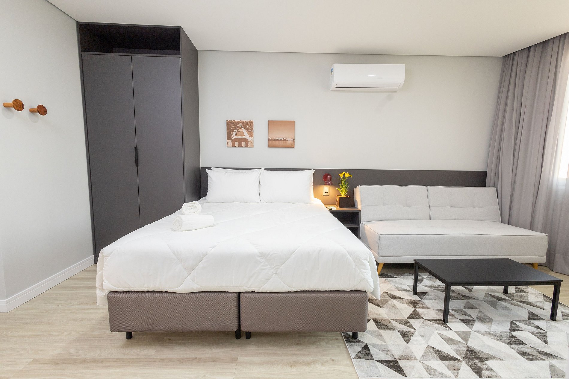 This apartment is equipped with: double bed, kitchen with cooktop stove, microwave, refrigerator, utensils/cutlery, split air conditioning, work/meal bench with chairs, sofa/armchair (check the photos in the ad), Smart TV , Wi-fi, hangers, closets and complete trousseau.