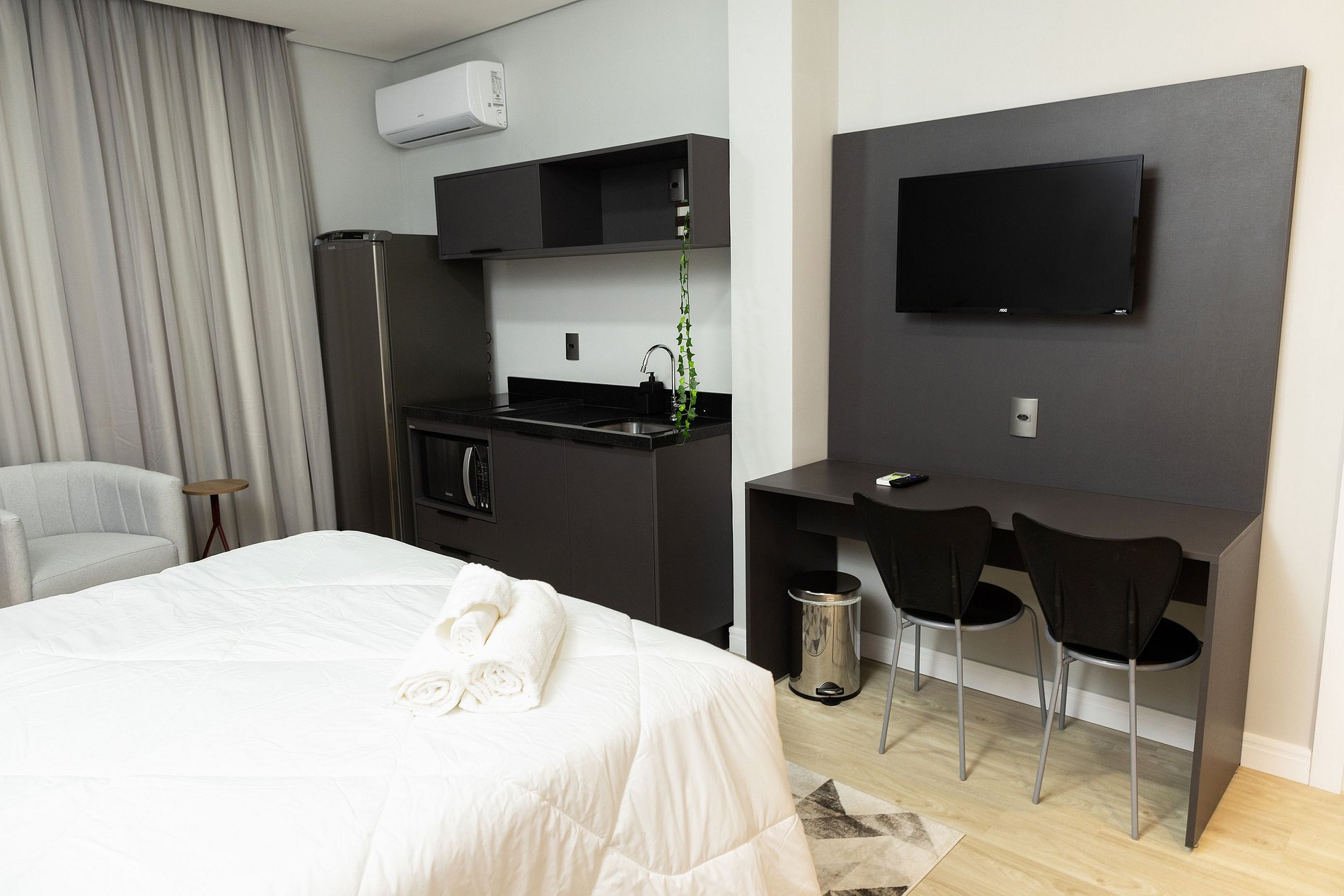 This apartment is equipped with: double bed, kitchen with cooktop stove, microwave, refrigerator, utensils/cutlery, split air conditioning, work/meal bench with chairs, sofa/armchair (check the photos in the ad), Smart TV , Wi-fi, hangers, closets and complete trousseau.