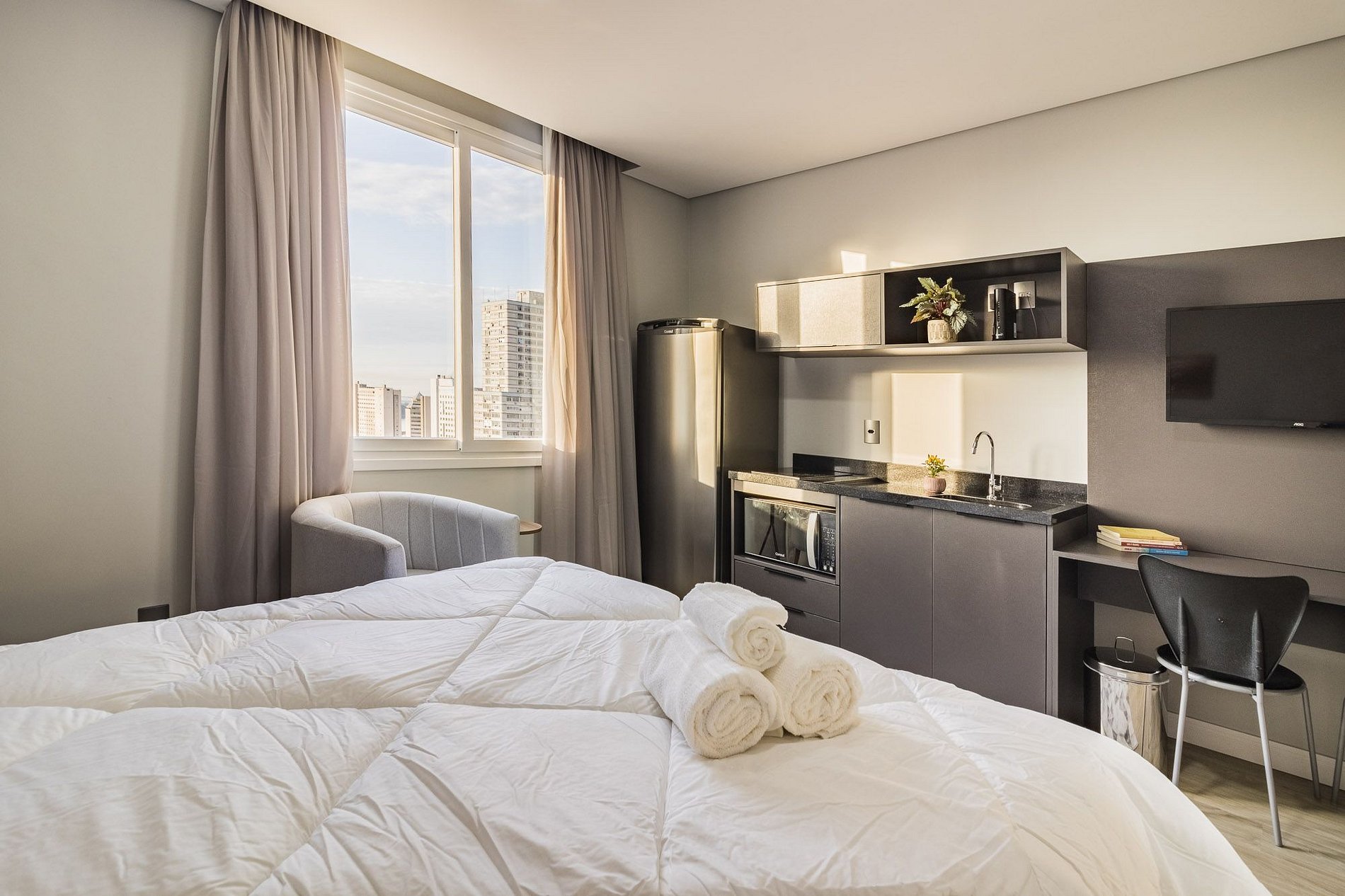 This apartment is equipped with: double bed, kitchen with cooktop stove, microwave, refrigerator, utensils/cutlery, split air conditioning, work/meal bench with chairs, sofa/armchair (check the photos in the ad), Smart TV , Wi-fi, hangers, closets and complete trousseau.