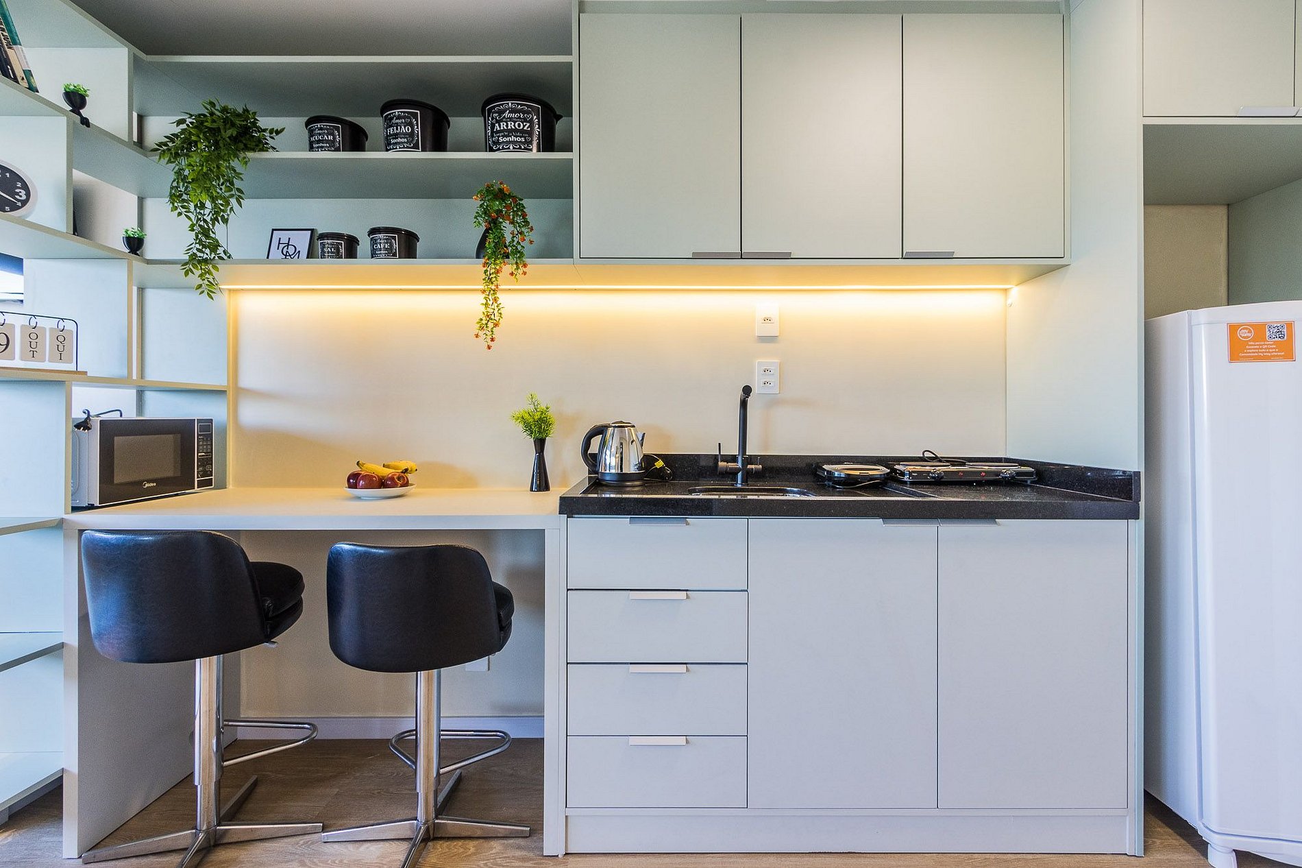 Furnished apartment ready to move in, stay in, or work from home in GO Cidade Baixa, a building located in the heart of the Cidade Baixa neighborhood, one of the most beloved in Porto Alegre.