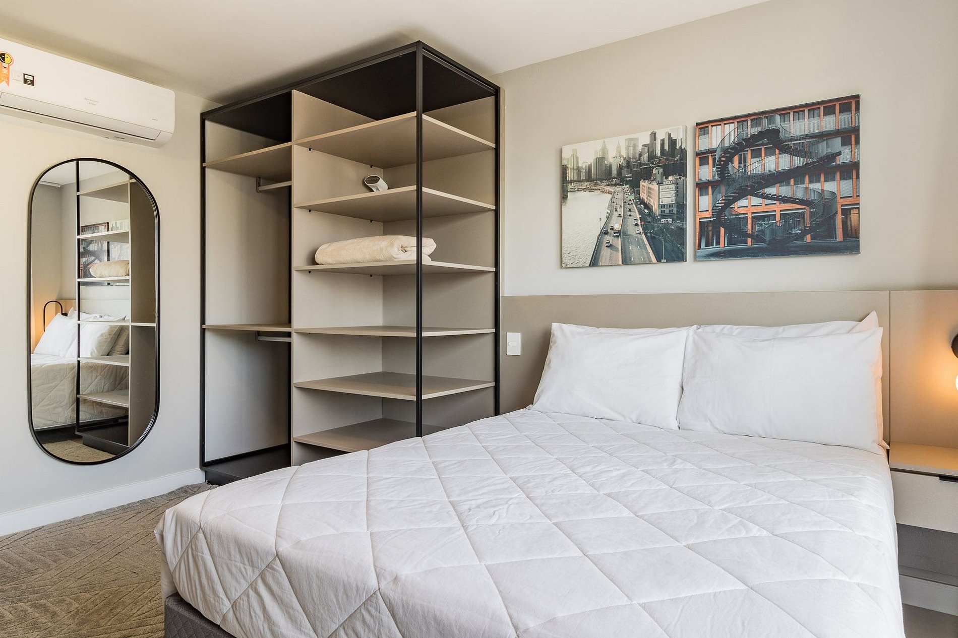 No quarto, você encontrará uma cama de casal confortável e um armário espaçoso, oferecendo amplo espaço para guardar suas roupas e pertences. O apartamento também dispõe de Wi-Fi para manter você conectado(a) e entretido(a) durante sua estadia.