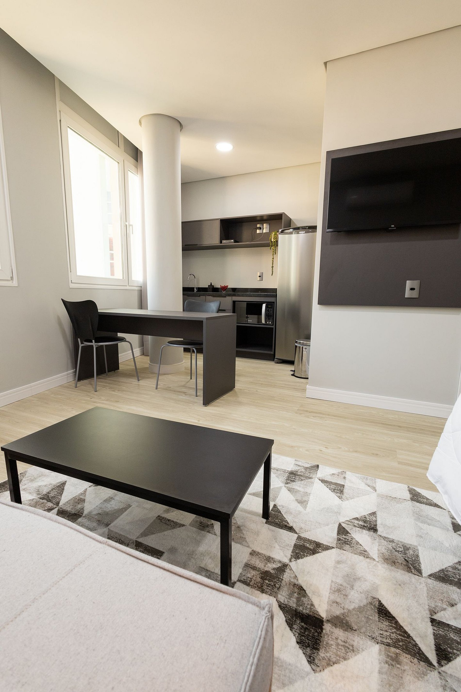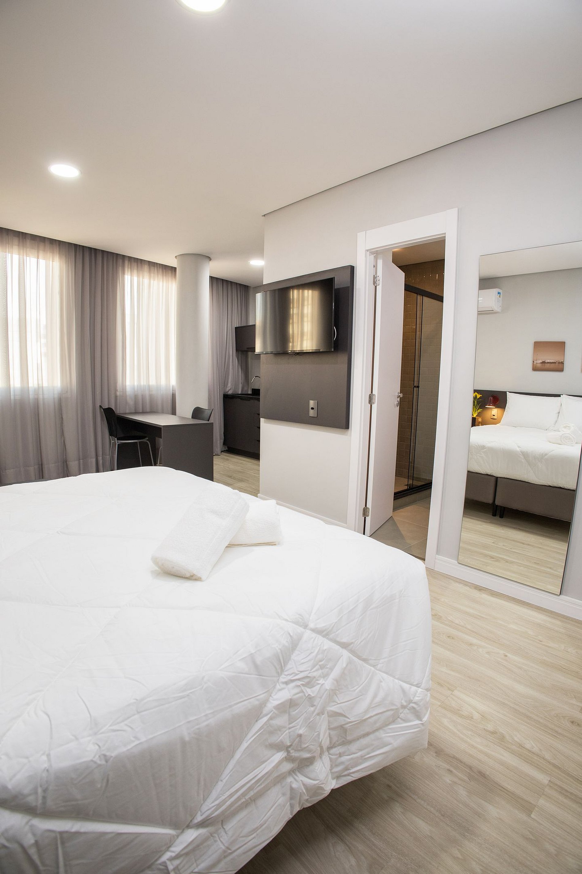 Esse apartamento está equipado com: cama de casal, cozinha com fogão cooktop, micro-ondas, geladeira, utensílios/talheres, ar condicionado split, bancada para trabalho/refeição com cadeiras, sofá/poltrona (conferir nas fotos do anúncio), Smart TV, Wi-fi, cabides, armários e enxoval completo.