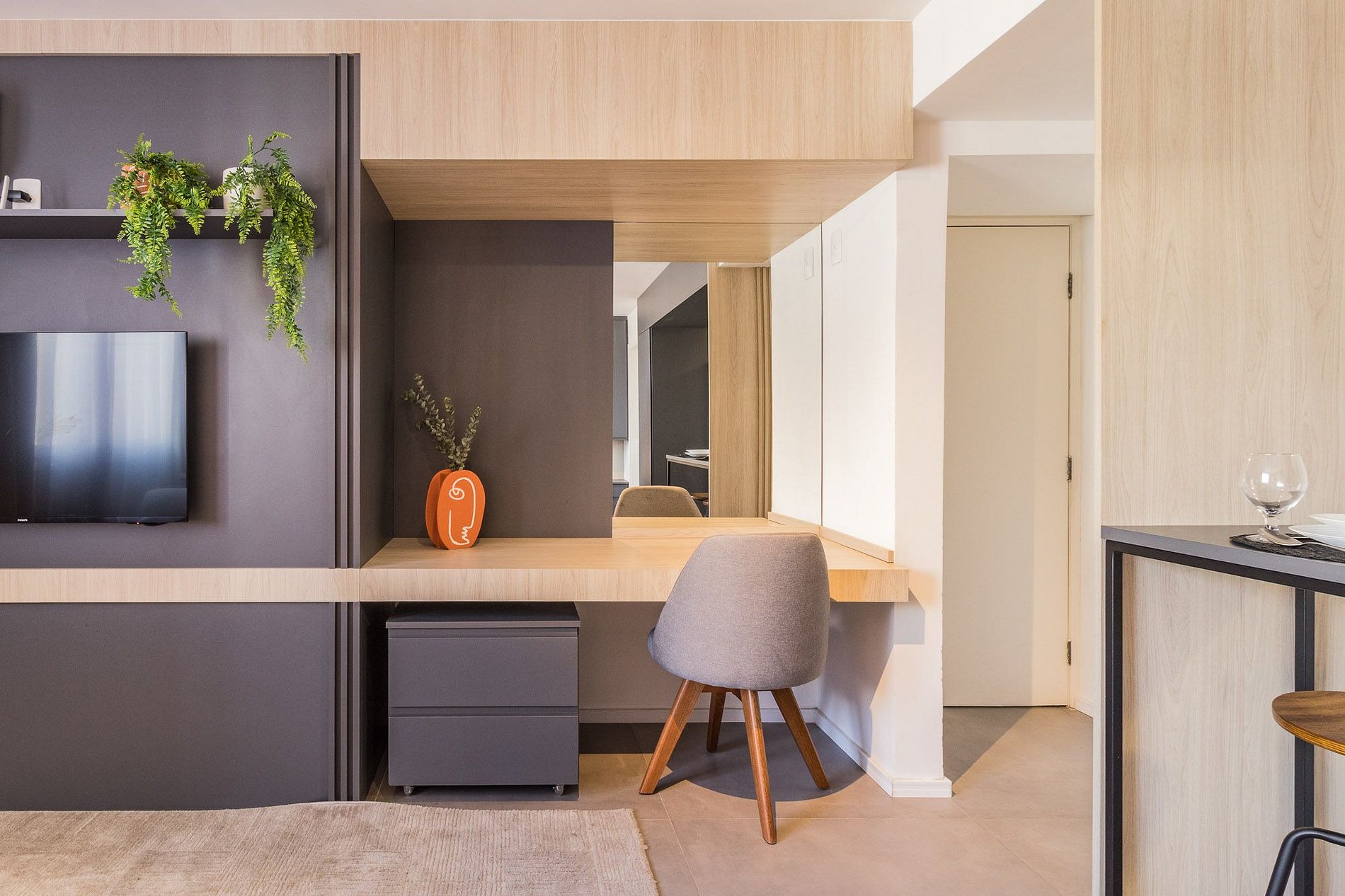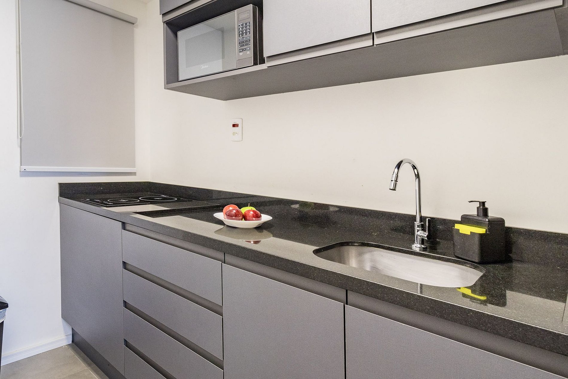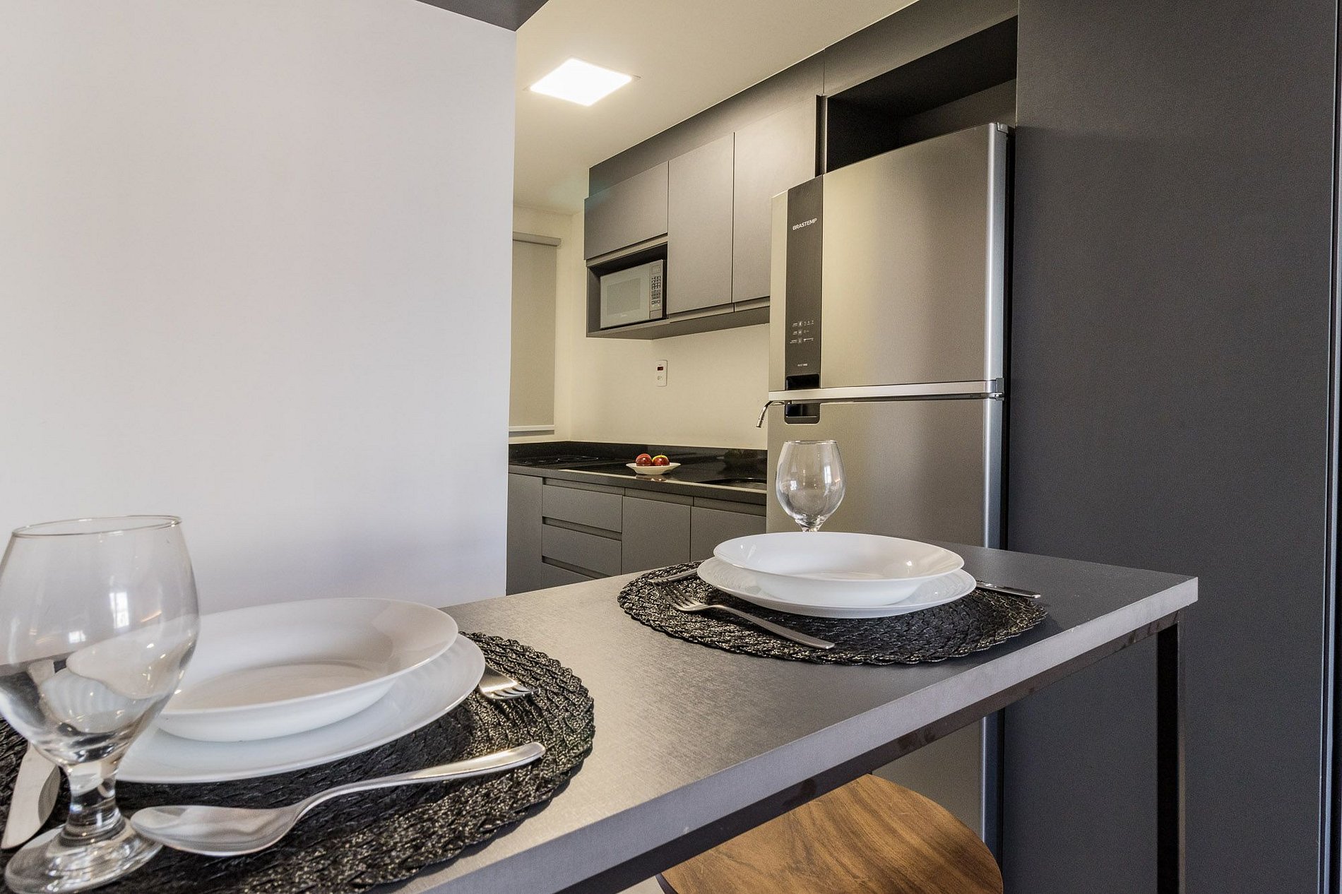 Esse apartamento está equipado com: cama de casal, cozinha com fogão cooktop, micro-ondas, geladeira, utensílios/talheres, ar condicionado split, bancada para trabalho/refeição com cadeiras, sofá, Smart TV, Wi-fi, cabides, armários e enxoval completo. Além disso, não é necessário se preocupar com lençóis, cobertores e toalhas, pois o apartamento é fornecido pronto para morar, com roupas de cama e banho inclusas. Caso deseje troca de enxoval ou limpeza durante sua estadia, basta contratar esses serviços através da My Way.