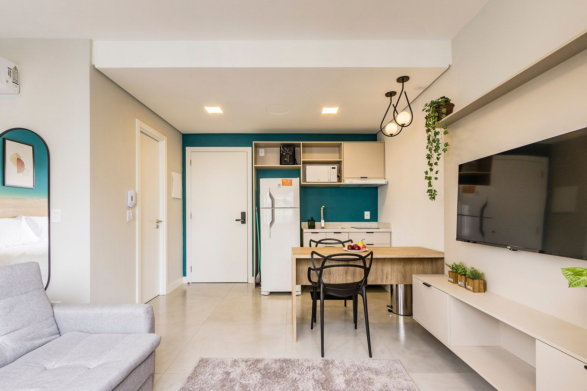 Apartamento mobiliado e pronto para morar, se hospedar ou trabalhar em home office no Mood Central Parque, um prédio localizado no bairro planejado Central Parque, próximo à Avenida Ipiranga.