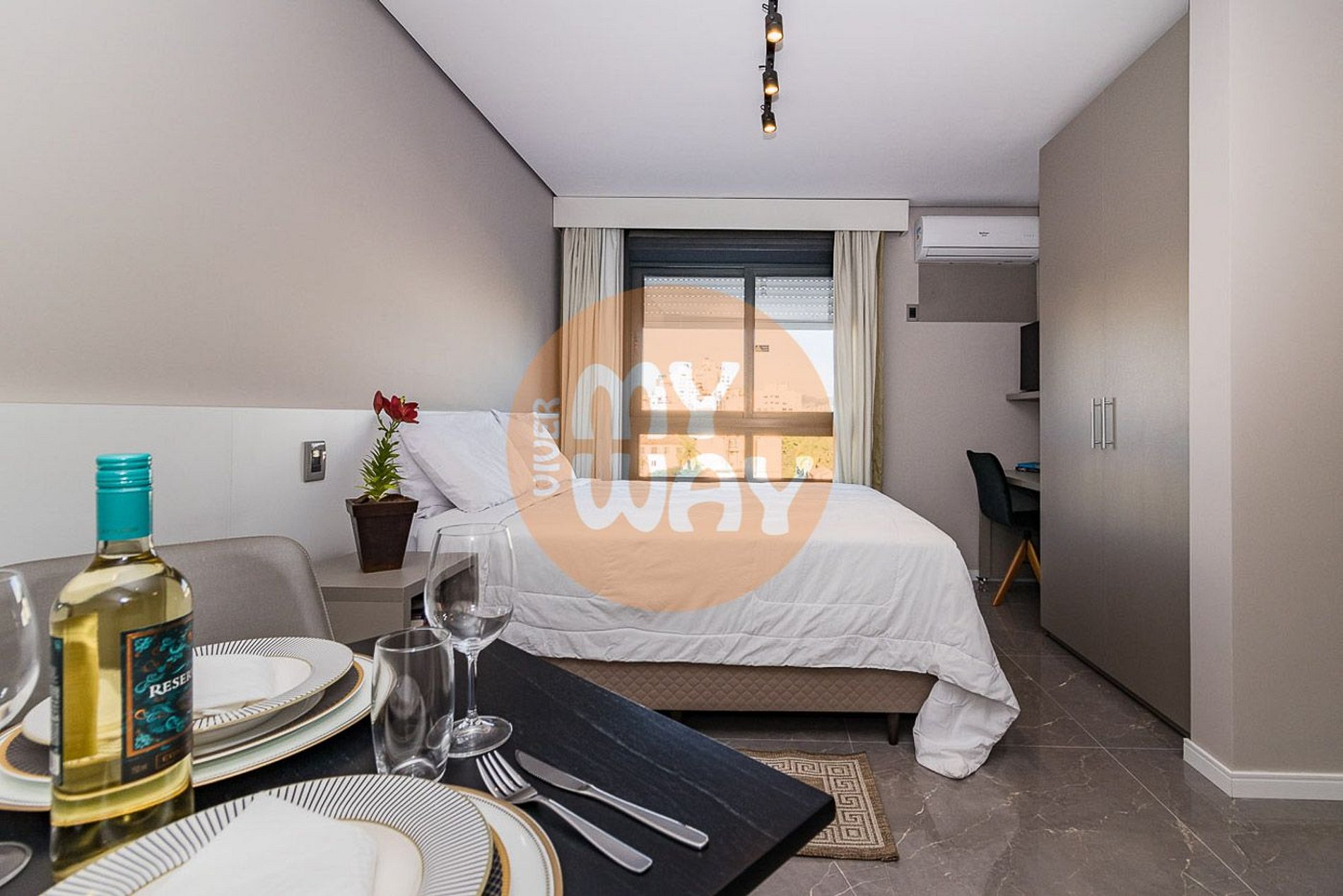Esse apartamento está equipado com: cama casal, ar condicionado split, bancada para trabalho com cadeira, TV, Wi-fi, frigobar, fogão cooktop, micro-ondas, utensílios de cozinha, cabides, armário e enxoval completo.