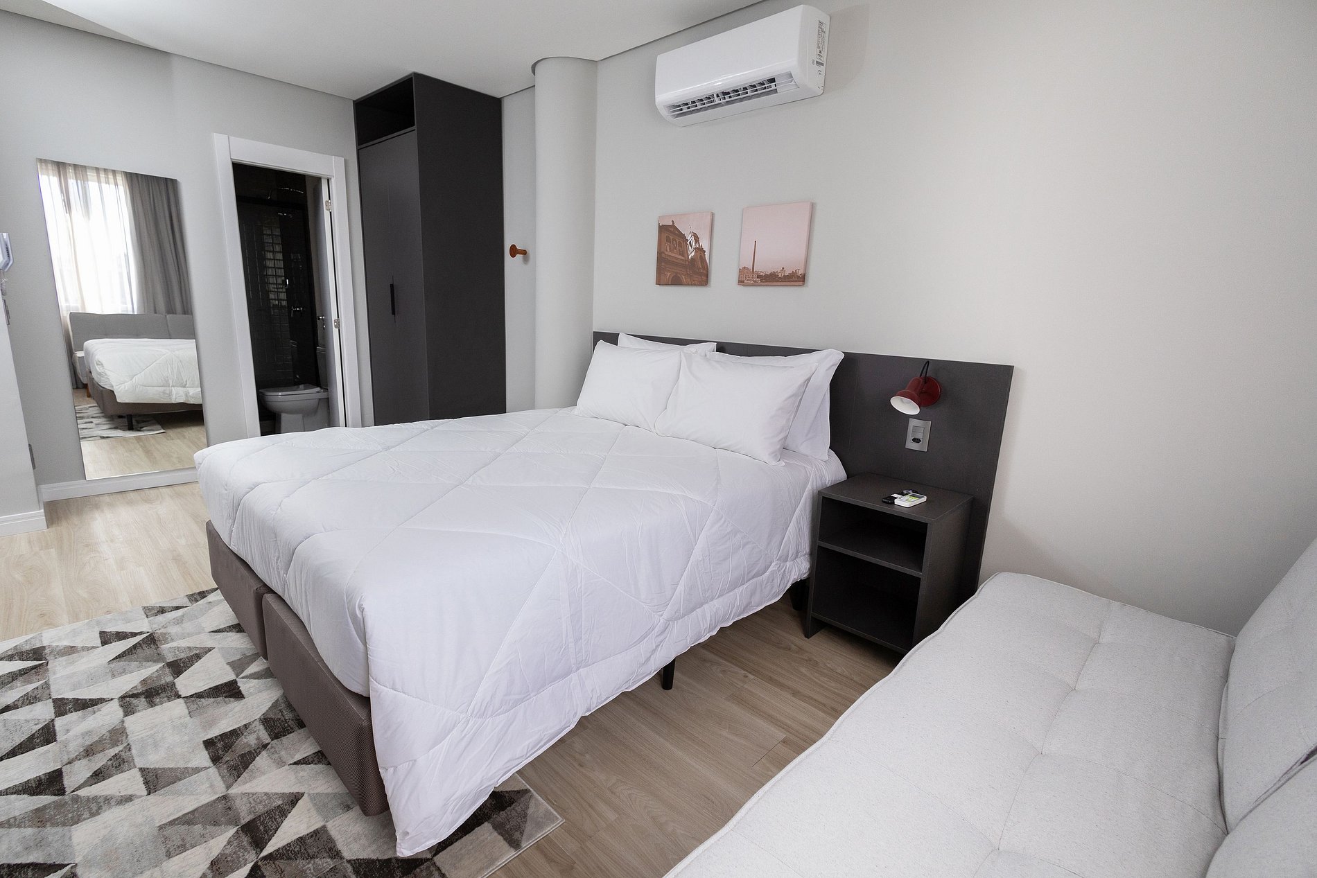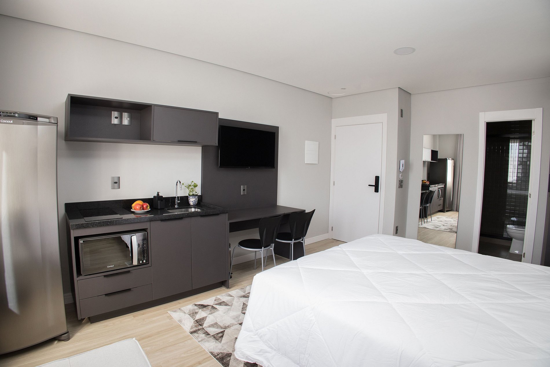 Esse apartamento está equipado com: cama de casal, cozinha com fogão cooktop, micro-ondas, geladeira, utensílios/talheres, ar condicionado split, bancada para trabalho/refeição com cadeiras, sofá/poltrona (conferir nas fotos do anúncio), Smart TV, Wi-fi, cabides, armários e enxoval completo.