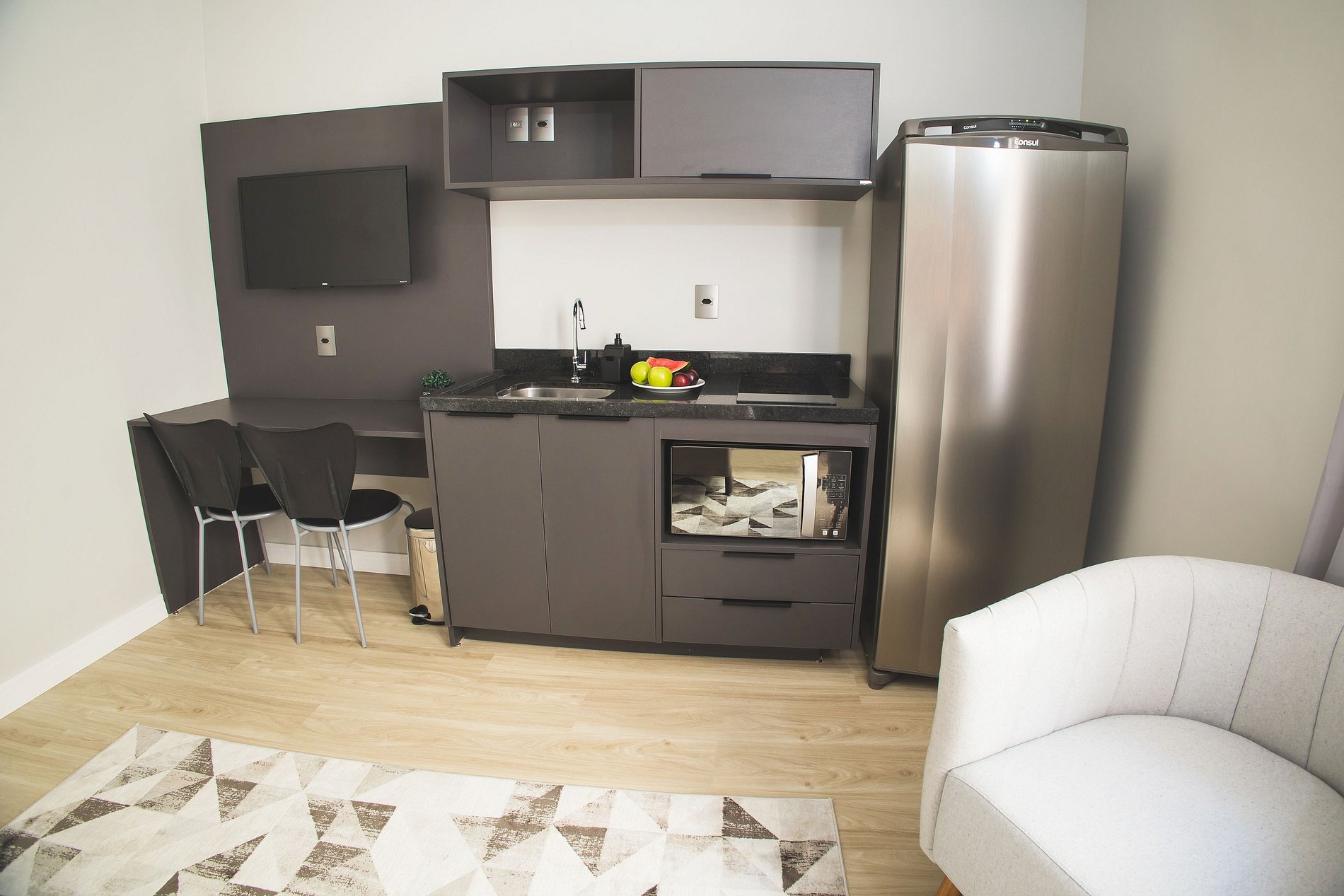 Esse apartamento está equipado com: cama de casal, cozinha com fogão cooktop, micro-ondas, geladeira, utensílios/talheres, ar condicionado split, bancada para trabalho/refeição com cadeiras, sofá/poltrona (conferir nas fotos do anúncio), Smart TV, Wi-fi, cabides, armários e enxoval completo.
