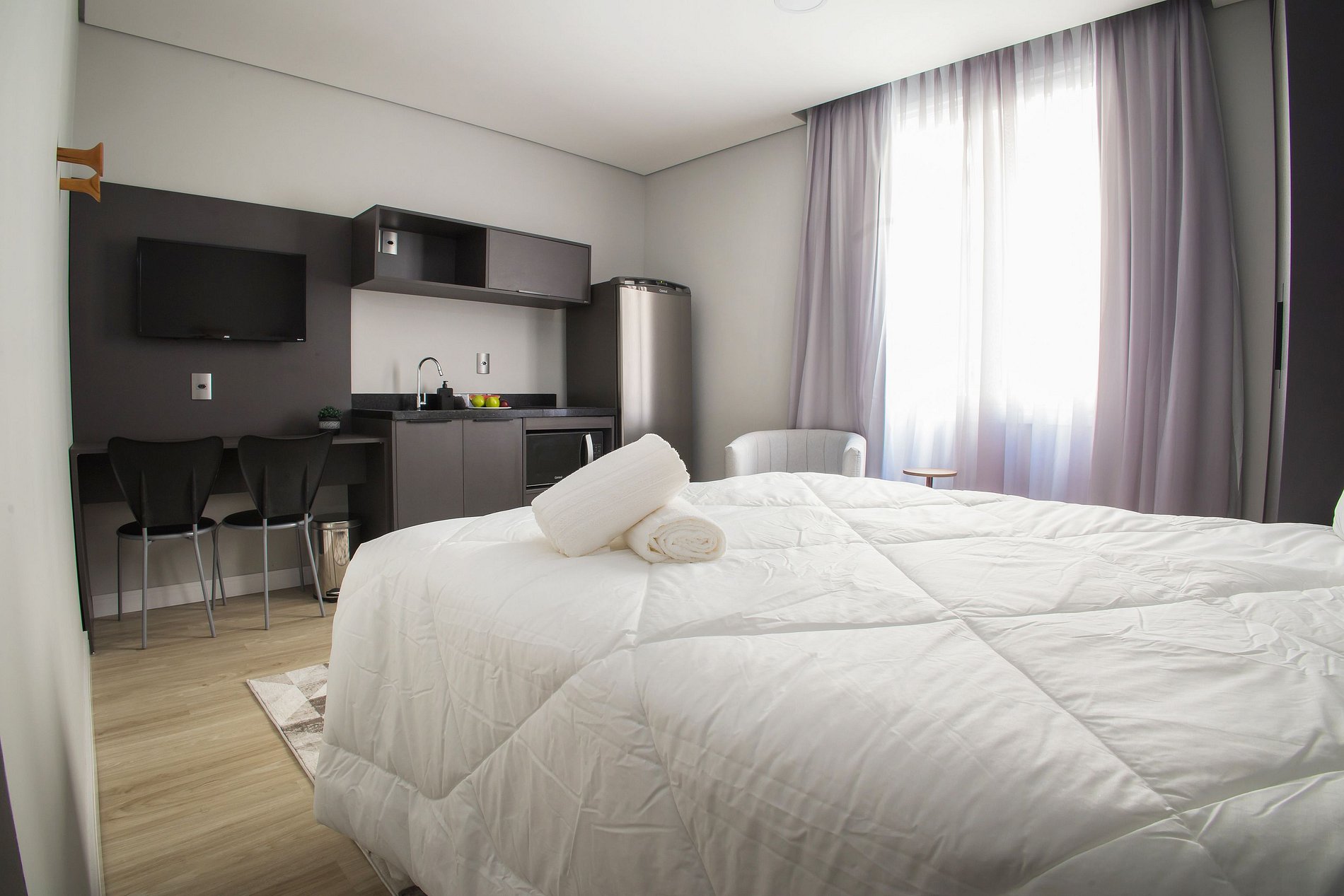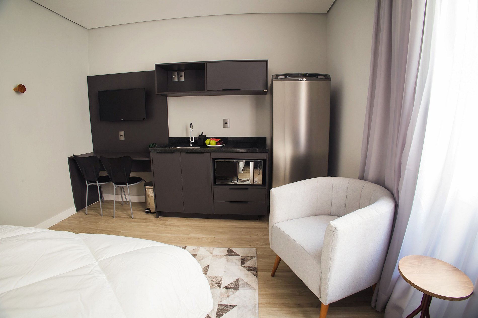 Esse apartamento está equipado com: cama de casal, cozinha com fogão cooktop, micro-ondas, geladeira, utensílios/talheres, ar condicionado split, bancada para trabalho/refeição com cadeiras, sofá/poltrona (conferir nas fotos do anúncio), Smart TV, Wi-fi, cabides, armários e enxoval completo.