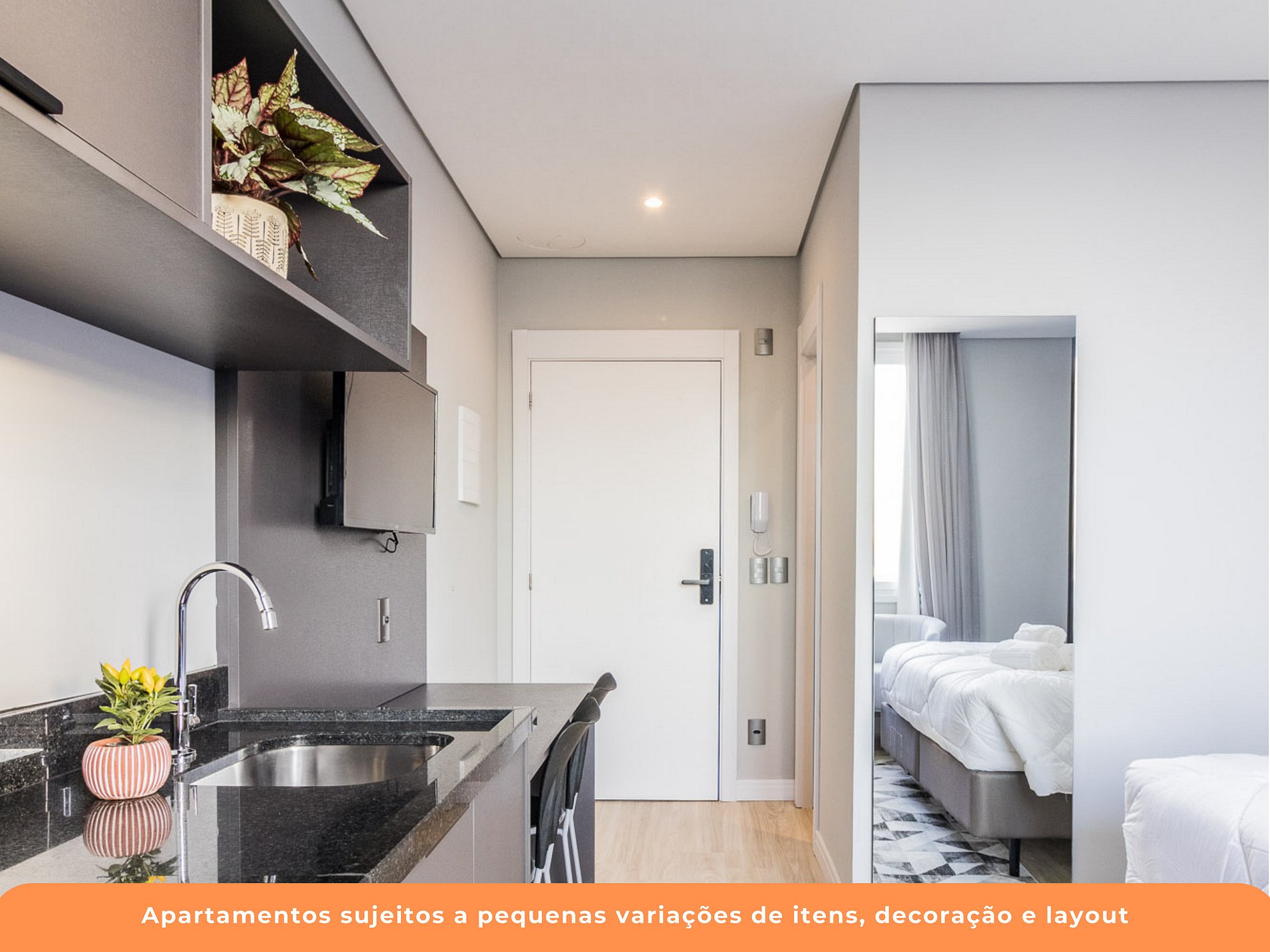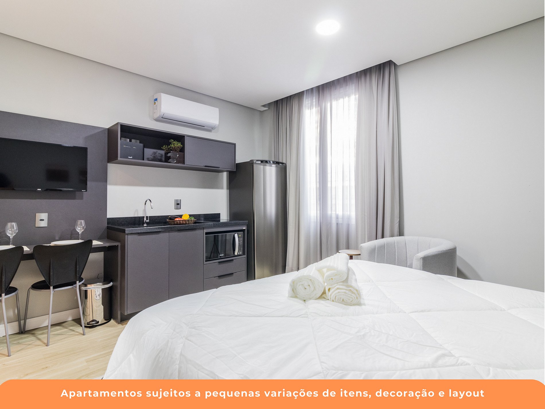 Esse apartamento está equipado com: cama de casal, cozinha com fogão cooktop, micro-ondas, geladeira, utensílios/talheres, ar condicionado split, bancada para trabalho/refeição com cadeiras, sofá/poltrona (conferir nas fotos do anúncio), Smart TV, Wi-fi, cabides, armários e enxoval completo.