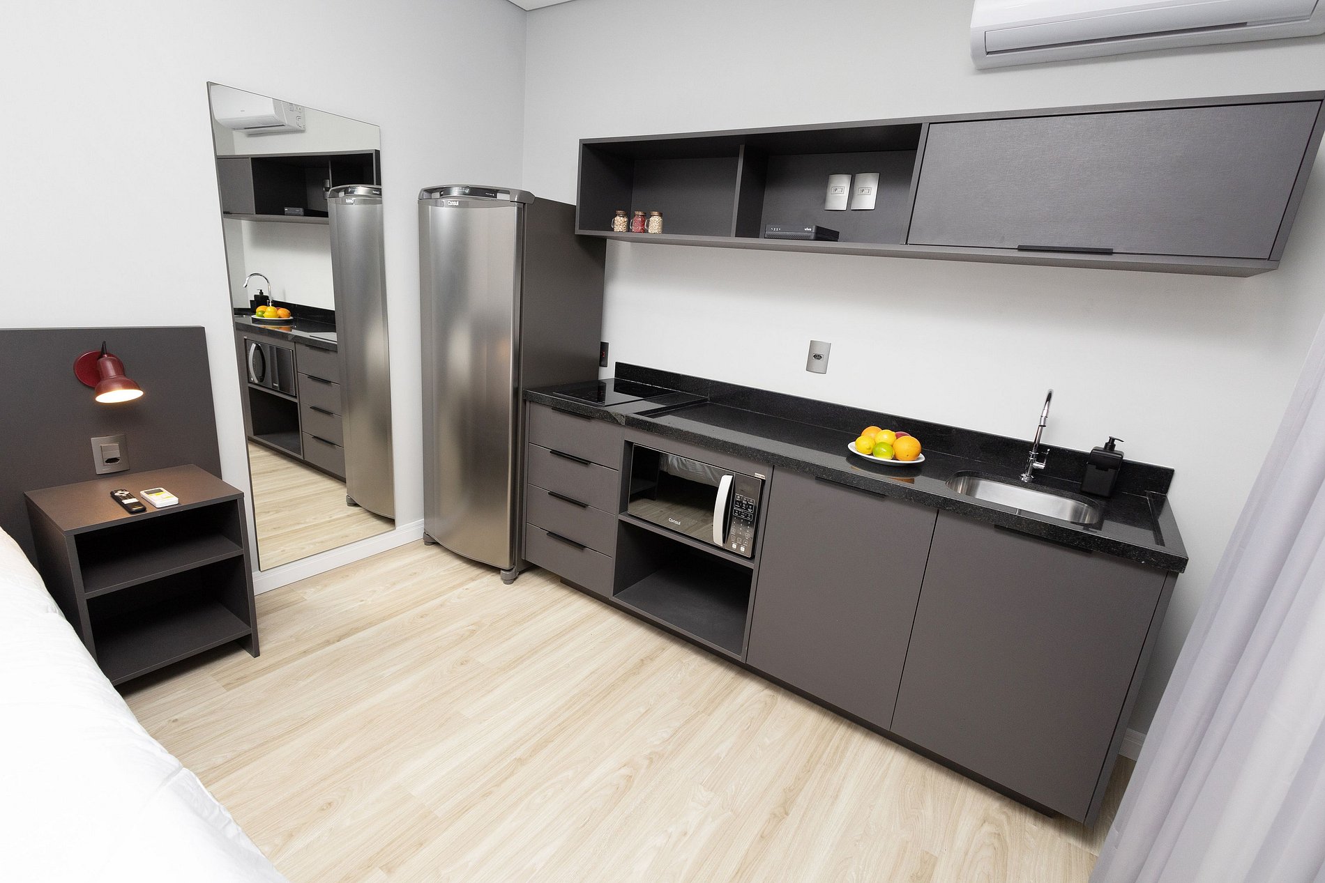 Esse apartamento está equipado com: cama de casal, cozinha com fogão cooktop, micro-ondas, geladeira, utensílios/talheres, ar condicionado split, bancada para trabalho/refeição com cadeiras, sofá/poltrona (conferir nas fotos do anúncio), Smart TV, Wi-fi, cabides, armários e enxoval completo.