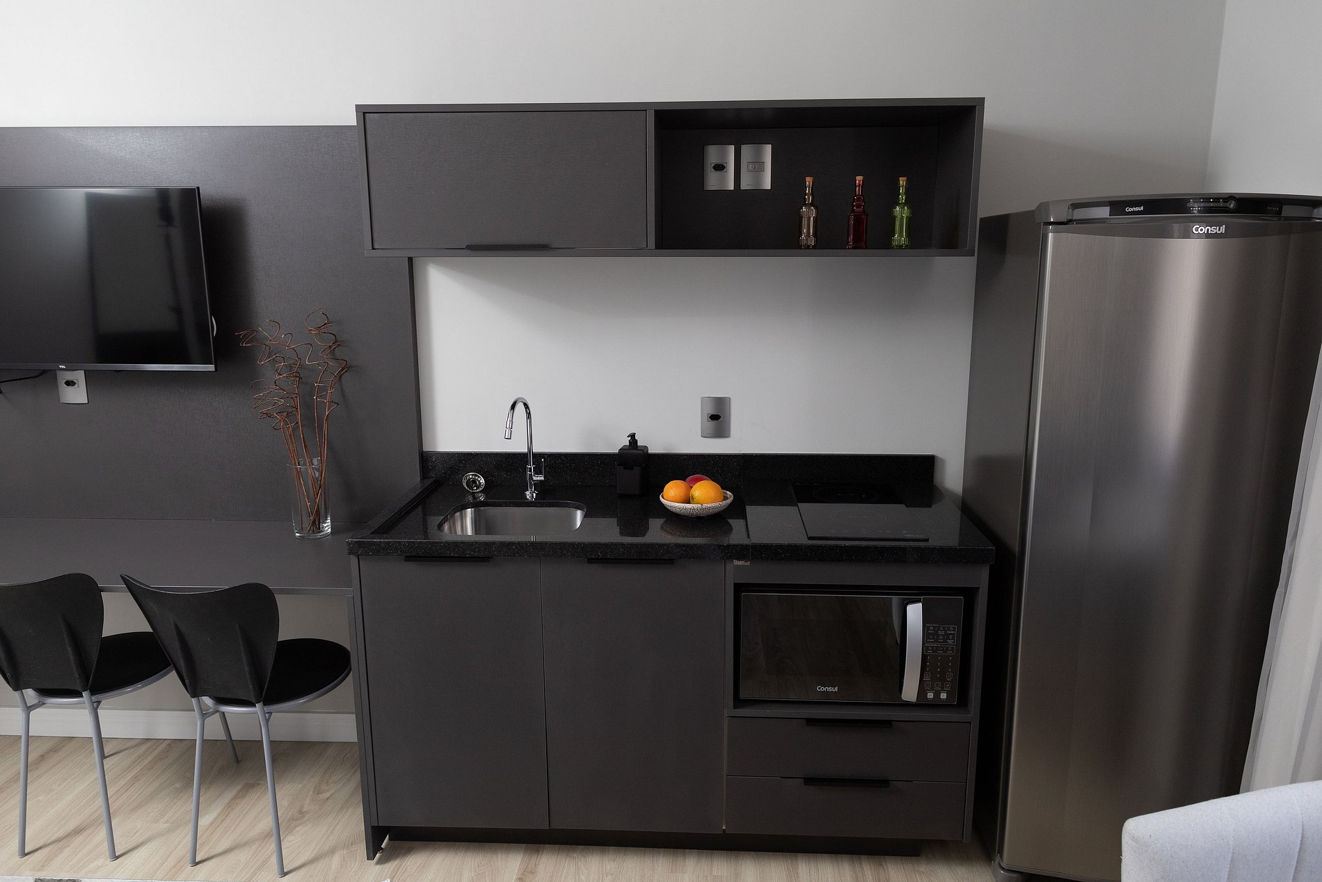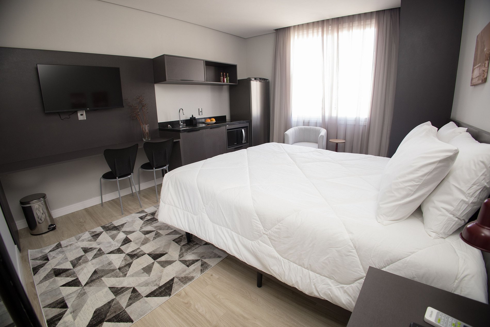 Esse apartamento está equipado com: cama de casal, cozinha com fogão cooktop, micro-ondas, geladeira, utensílios/talheres, ar condicionado split, bancada para trabalho/refeição com cadeiras, sofá/poltrona (conferir nas fotos do anúncio), Smart TV, Wi-fi, cabides, armários e enxoval completo.