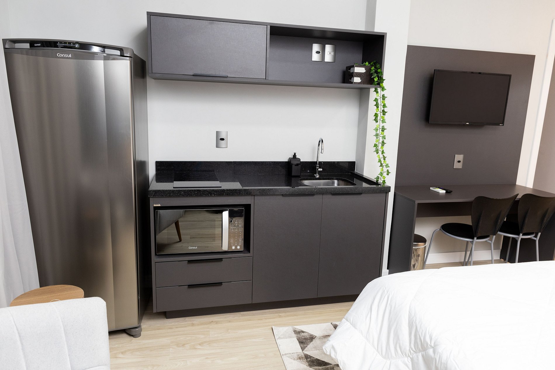 Esse apartamento está equipado com: cama de casal, cozinha com fogão cooktop, micro-ondas, geladeira, utensílios/talheres, ar condicionado split, bancada para trabalho/refeição com cadeiras, sofá/poltrona (conferir nas fotos do anúncio), Smart TV, Wi-fi, cabides, armários e enxoval completo.