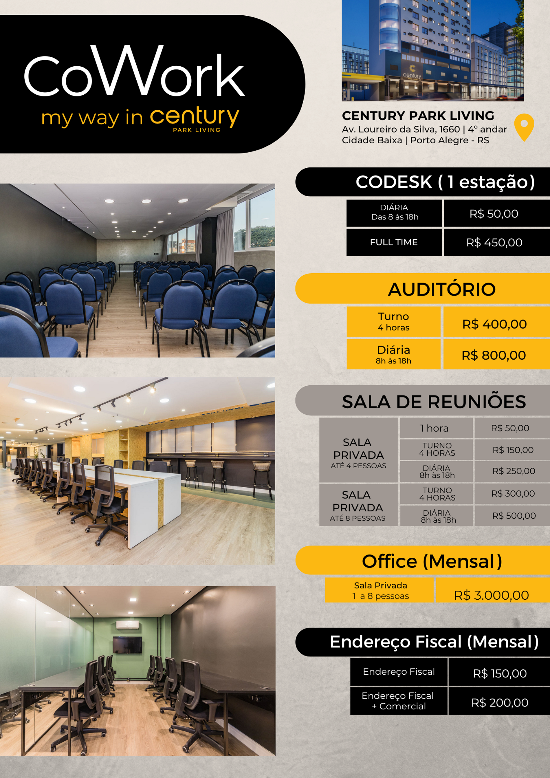 O CoWork My Way in Century fica no 4º andar do prédio, e conta com excelente internet de link dedicado, café e água liberados, copa de apoio e também com serviço de impressão de documentos. Para acessar o prédio, entre em contato conosco para receber uma chave virtual válida nos dias da reserva. O Coworking funciona de segunda a sexta-feira, das 08h às 18h. Caso deseje, é possível utilizar também salas de reuniões, sob reserva.